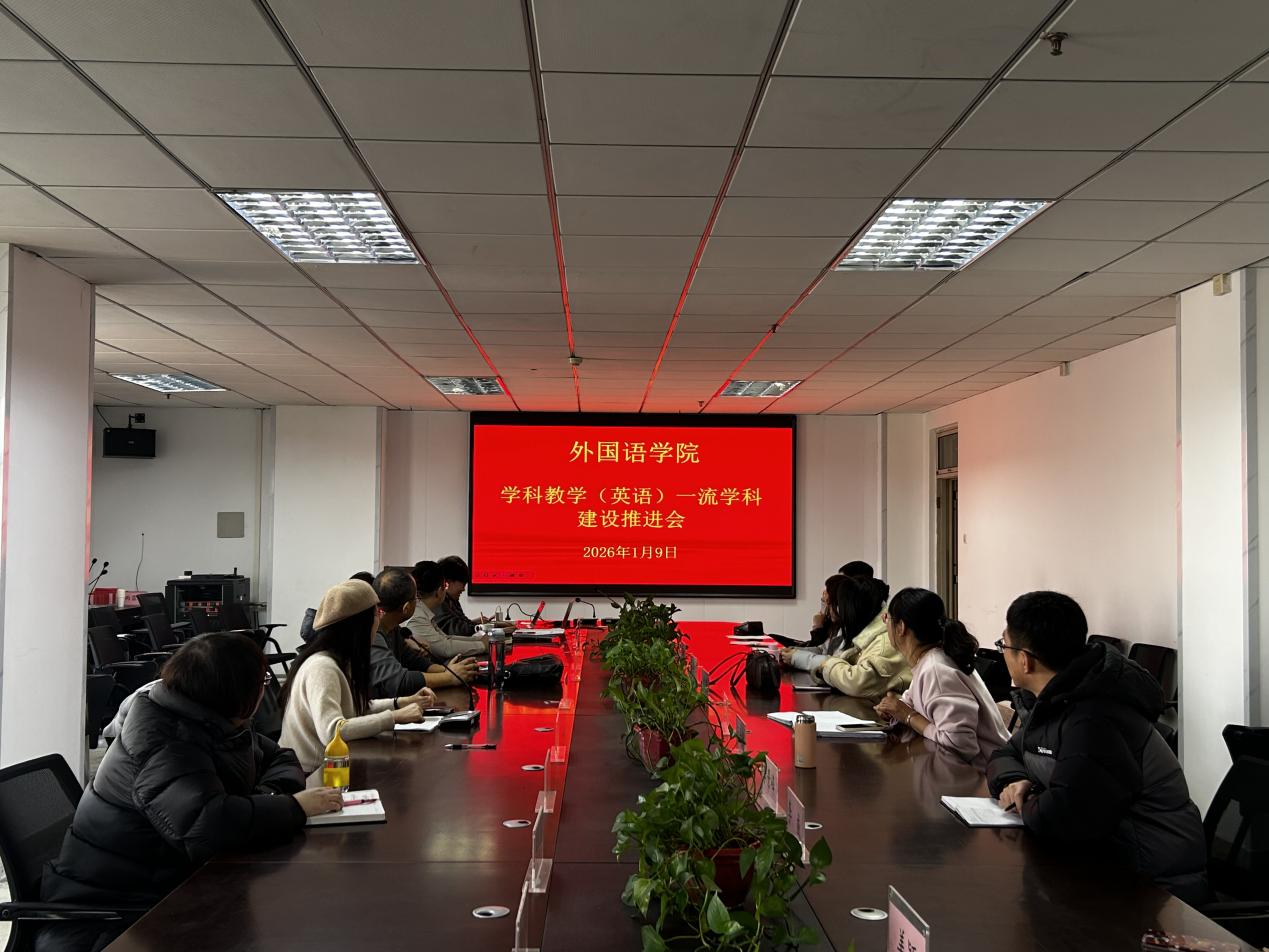 为深入贯彻落实国家教育发展战略,全面提升学科教学(英语)一流硕士点建设项目水平,为硕士点申报工作奠定坚实基础,外国语学院于2026年1月9日上午在学院会议室召开了学科教学(英语)学科建设推进会。会议由外国语学院院长唐翠云教授主持,副院长王丹丹及全体相关教师出席会议,共同为学科高质量发展凝聚智慧与力量。