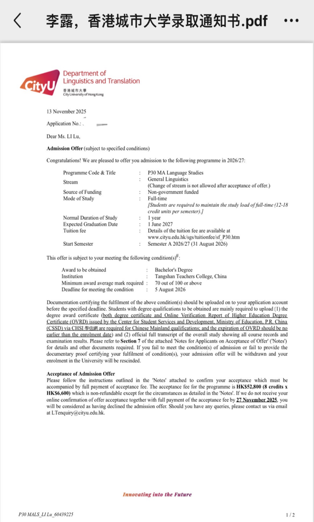近日,我院2022级英语专业学生李露凭借优异表现,成功获得香港城市大学研究生录取通知书,成为我院2026届毕业生中首位获得研究生录取通知书的学生。这一成绩既是她个人勤奋努力的成果,也展现了外国语学院在党建与育人结合方面的持续探索。
